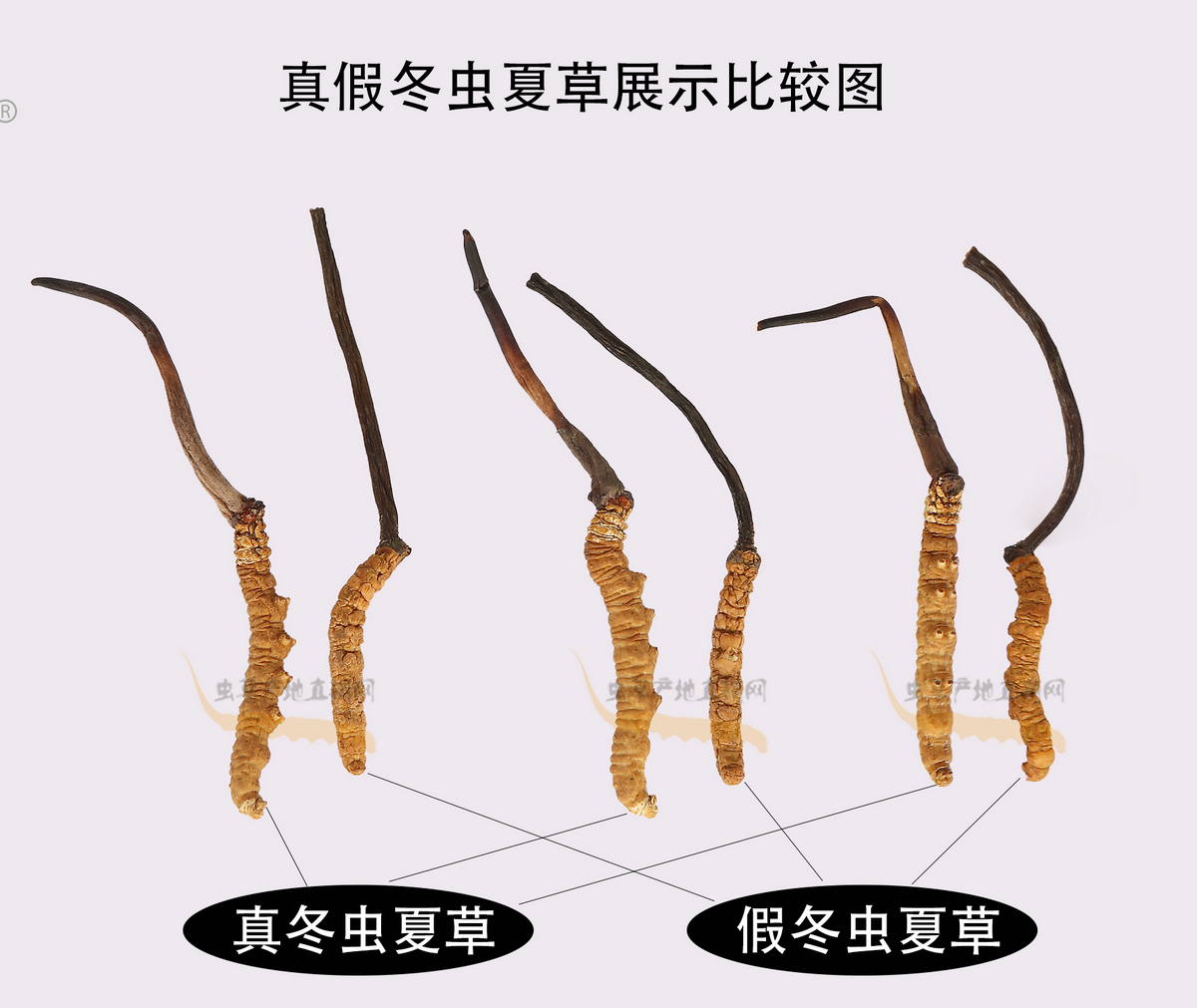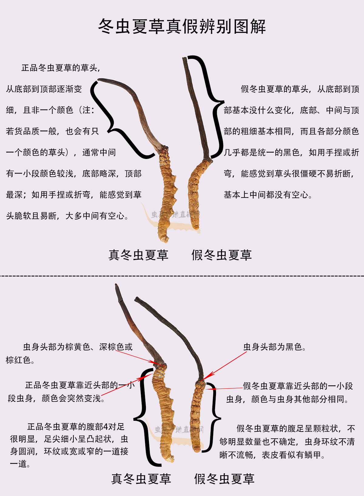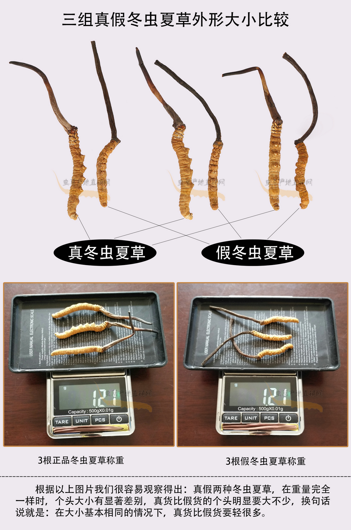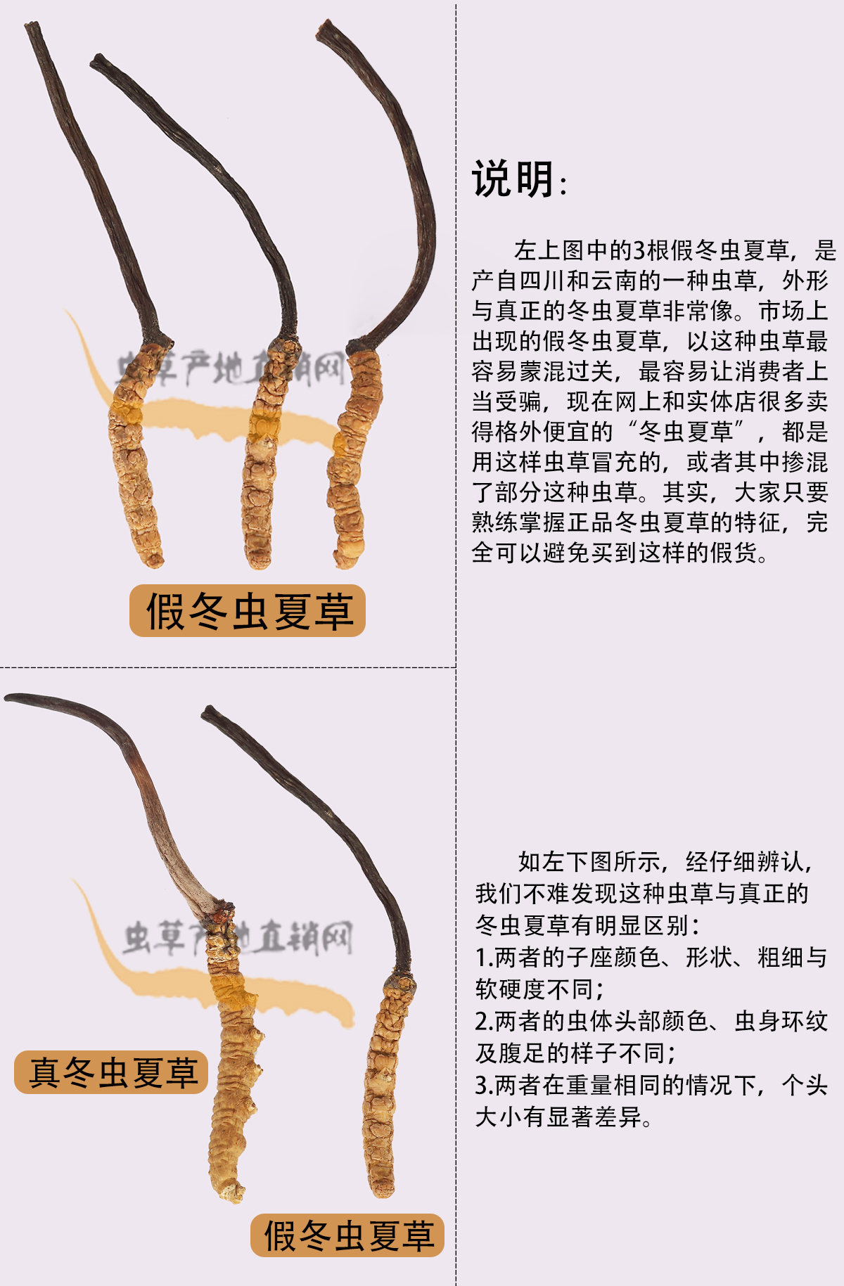 以上圖片,將這種產(chǎn)自四川和云南、極易被不法商家用來(lái)冒充正品的假冬蟲(chóng)夏草與真冬蟲(chóng)夏草的外形特征區(qū)別,介紹得非常清楚,相信大家在認(rèn)真看過(guò)之后,就能避免買(mǎi)到這種假蟲(chóng)草了。